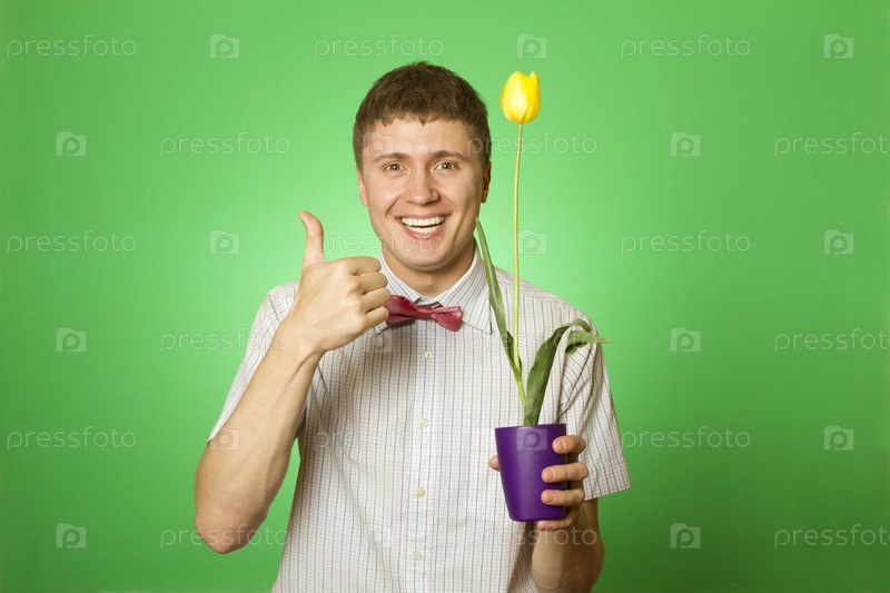 Счастливый молодой человек с желтым тюльпаном в горшке на зеленом фоне