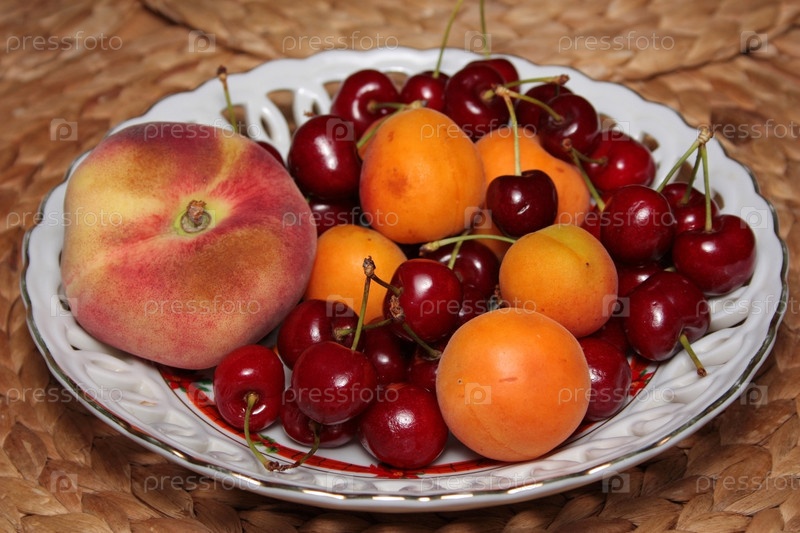 Черешня и персики на тарелке