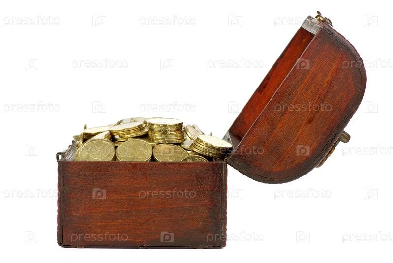 Сундук с монетами на белом фоне