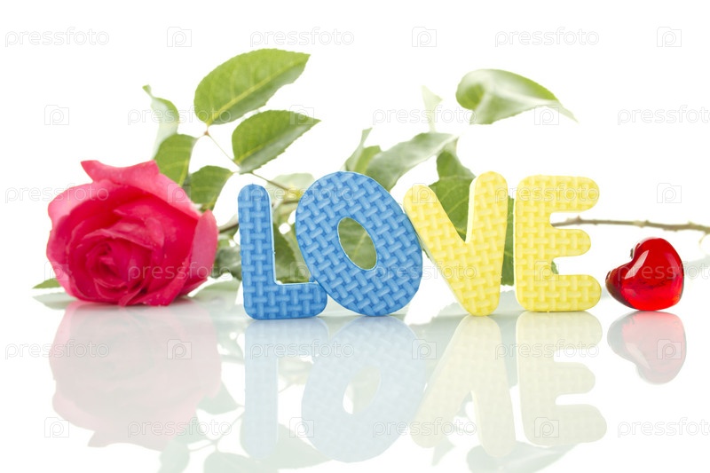 Красная роза, красное сердце и надпись "Любовь" по-английски на белом фоне