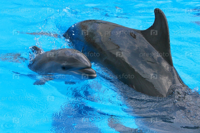 Маленький дельфин с матерью в бассейне