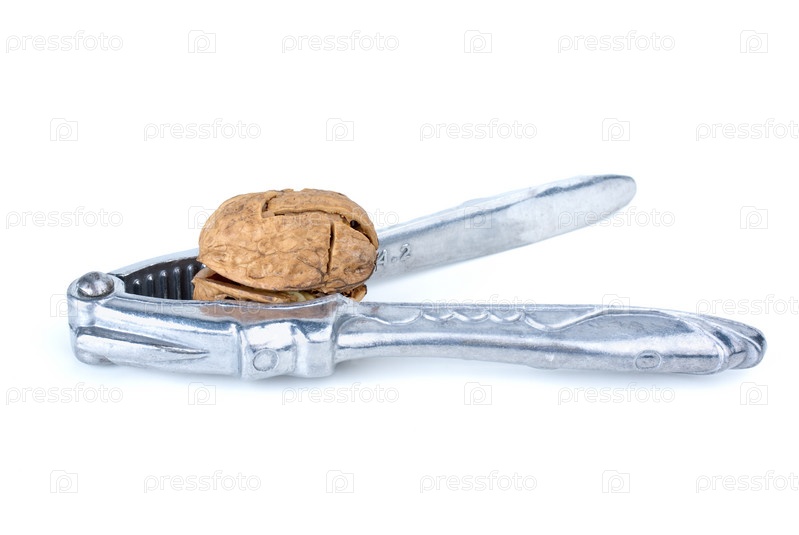 Щипцы для колки орехов и расколотый грецкий орех на белом фоне