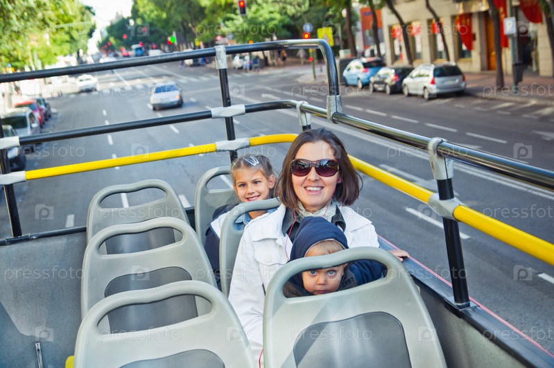 Молодая мать с детьми на экскурсии в автобусе