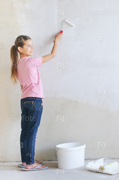 Девочка красит стену малярным валиком