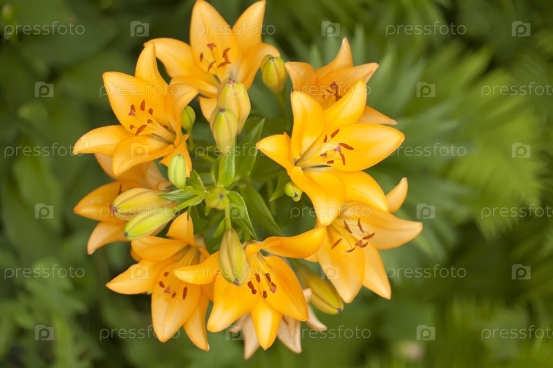 Оранжевые лилии крупным планом на зеленом фоне