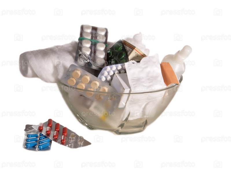 Медикаменты и другие лекарственные средства в прозрачной миске