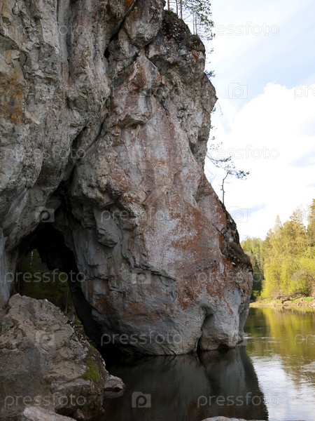 Скала "Дыроватый камень" (Пьющая лошадь). Река Серга. Природный парк "Оленьи ручьи". Свердловская область