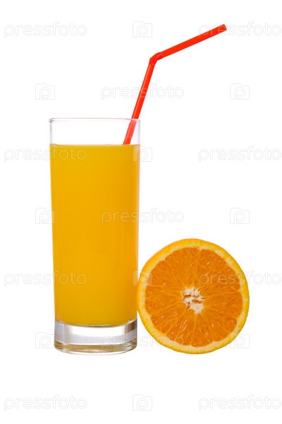 Апельсиновый сок и половинка апельсина на белом фоне