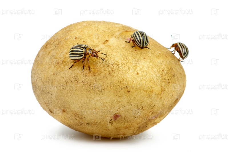 Несколько колорадских жуков, оккупировавших клубень картофеля. Изолировано на белом фоне