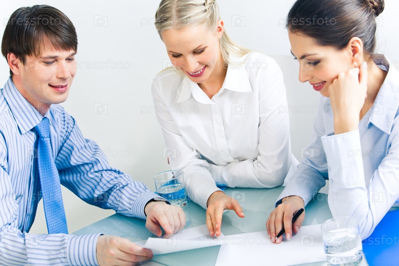 Фото деловых партнеров, которые смотрят на документ и обсуждают его на встрече