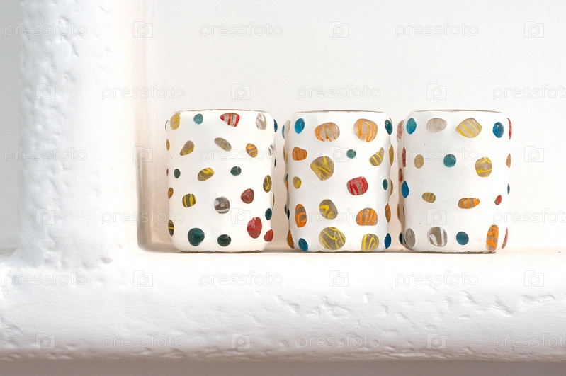 Три ярких декоративных стакана на полке