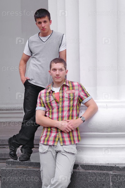 Двое молодых парней возле белых колонн, ВВЦ, Москва