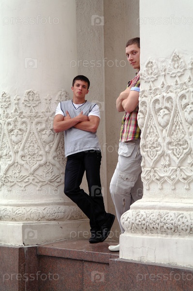 Двое молодых парней возле белых колонн, ВВЦ, Москва