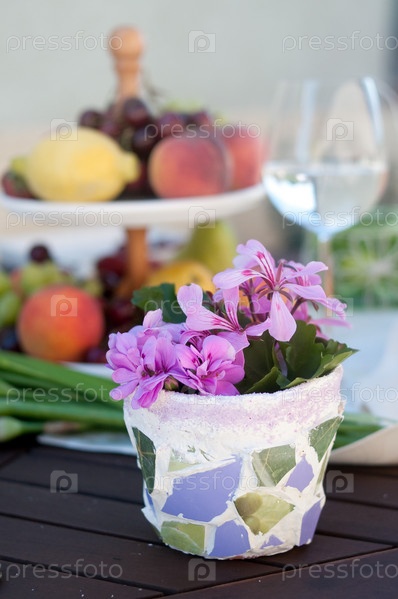 Цветы в горшке на фоне сервированного стола