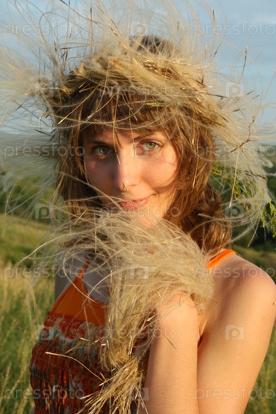 Женщина в сарафане и венке гуляет в поле солнечным летним днем