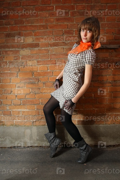 Стильная девушка на фоне кирпичной стены