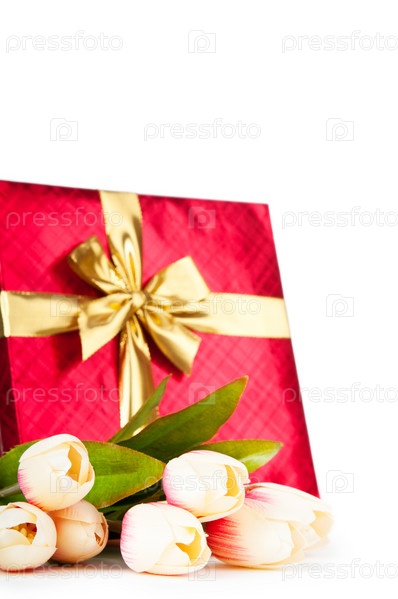 Букет тюльпанов и подарок на белом фоне