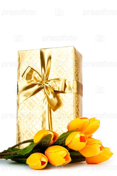 Букет желтых тюльпанов и подарок на белом фоне