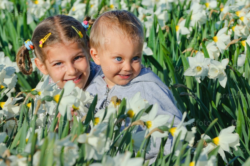 Девочка с маленьким братом на лугу с нарциссами