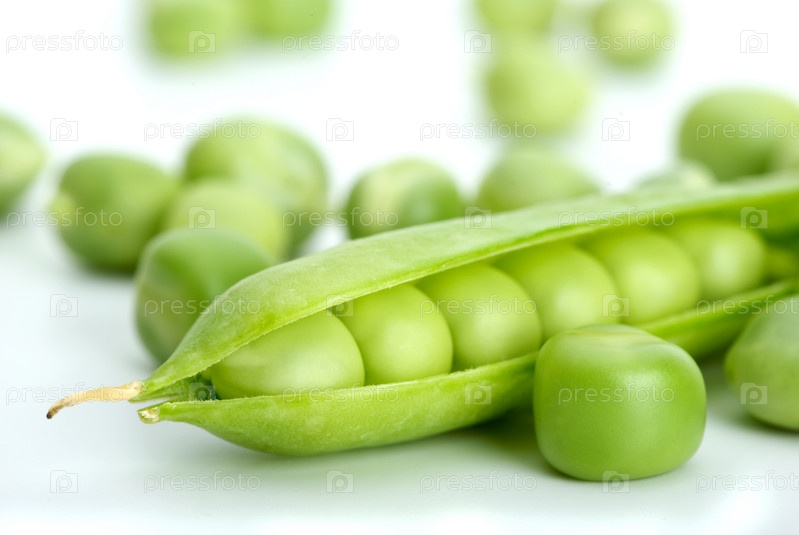 Раскрытый стручок гороха и несколько горошин на белом фоне