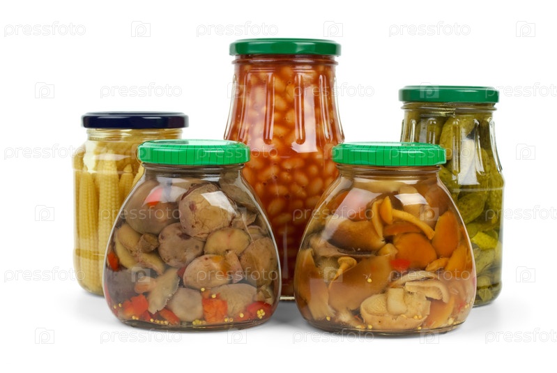 Банки с маринованными овощами (фасоль, кукуруза, огурцы) и грибами (маслята, опята) на белом фоне