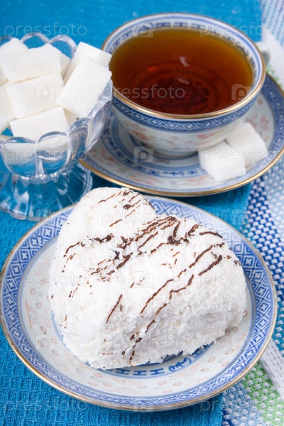 Пирожное в форме сердца с чаем на синей скатерти