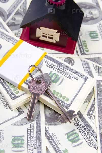 Игрушечный дом и ключи на фоне долларов
