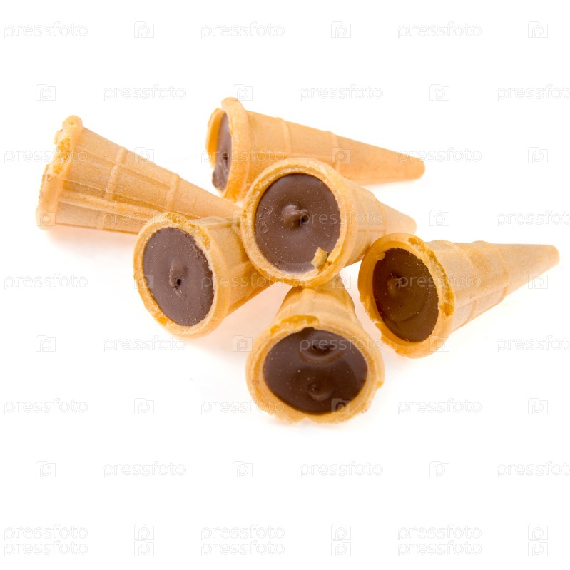 Вафельные рожки с шоколадной начинкой на белом фоне