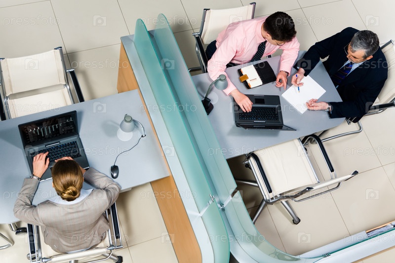 Изображение бизнесменов, сидящих через стену и работающих в офисе