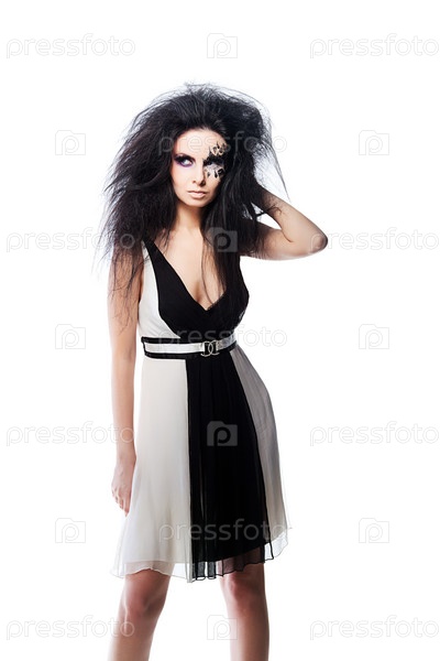 Женщина в черно-белом платье с черными волосами и фейс-артом