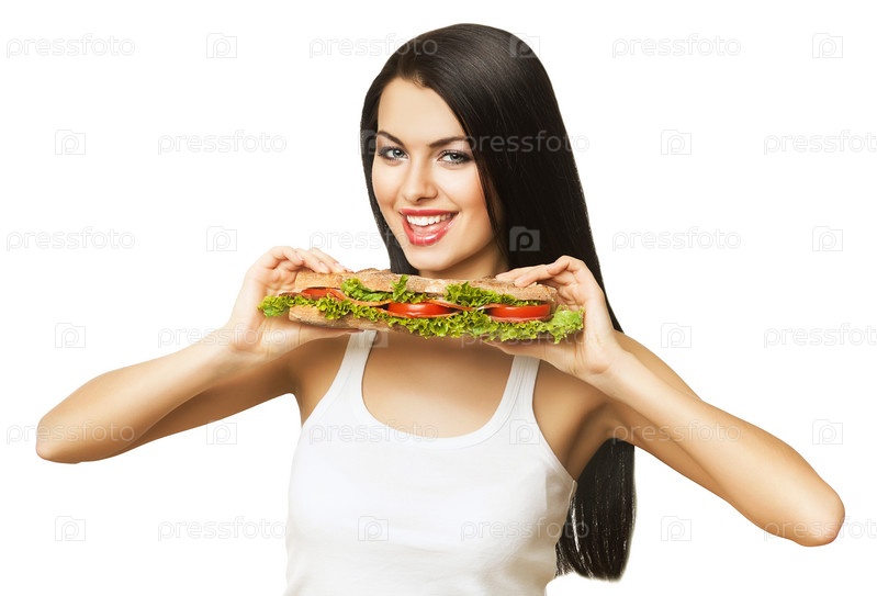 Веселая девушка с длинным бутербродом