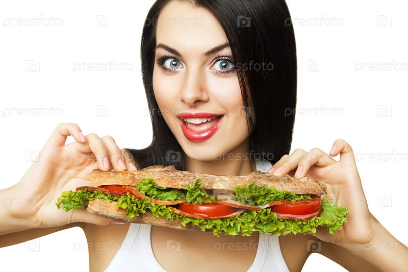 Веселая девушка с длинным бутербродом