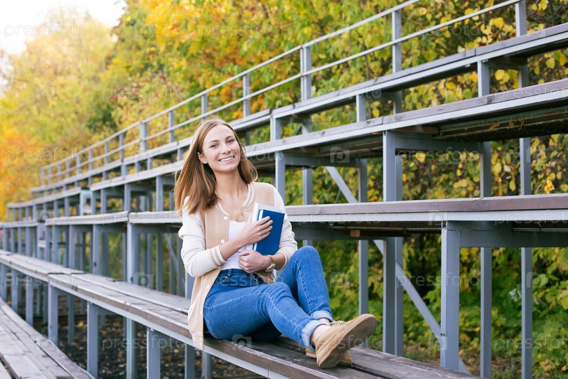 Студент сидит на трибуне с книгой