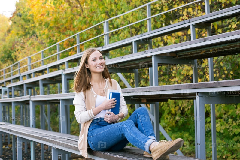 Студент сидит на трибуне с книгой