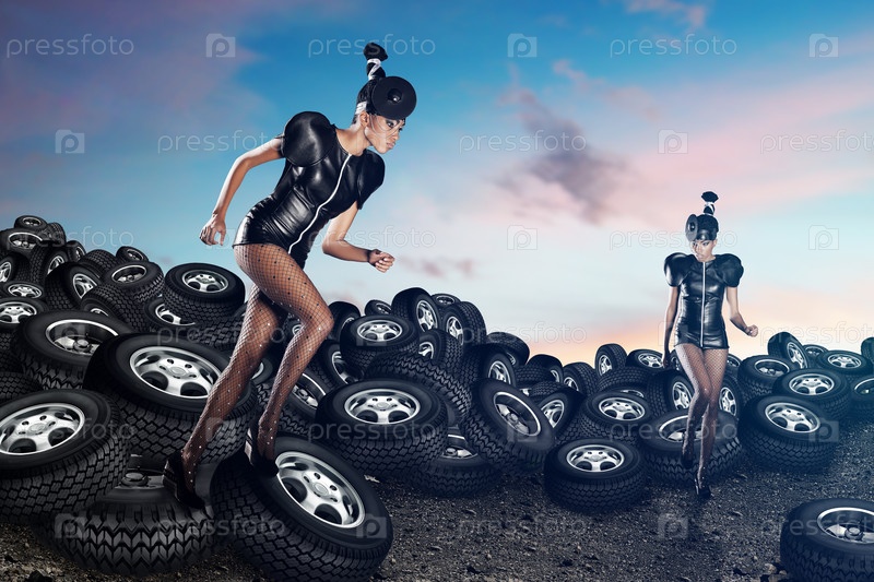 Модели позируют на фоне автомобильных шин