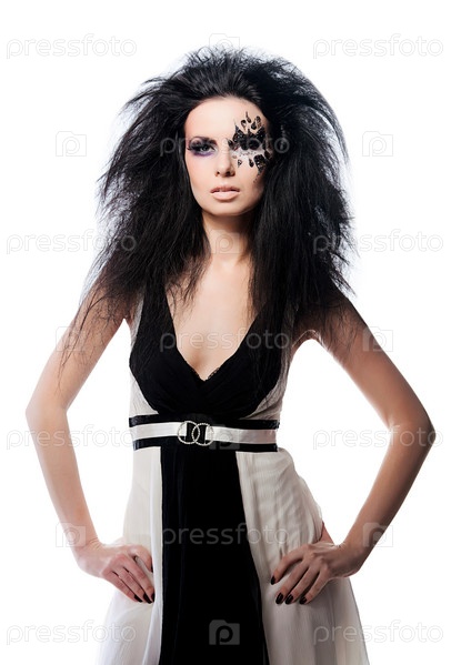 Женщина в черно-белом платье с черными волосами