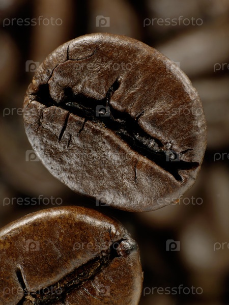 Кофейные бобы в глубоких тени на фоне нефокусированных зерен