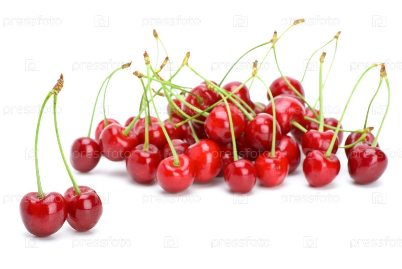 Кучка ягод черешни и пара ягод на переднем плане на белом фоне