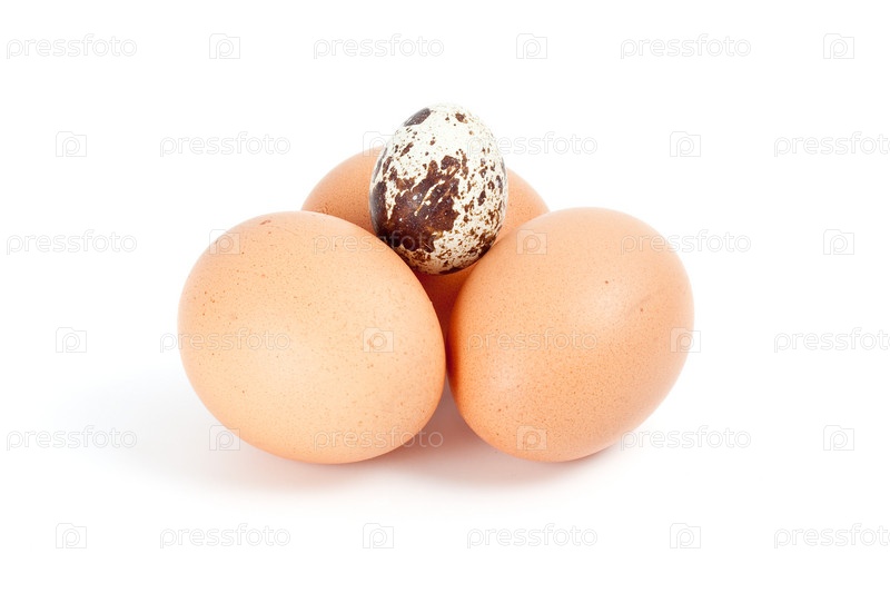 Три куриных яйца и одно перепелиное сверху на белом фоне