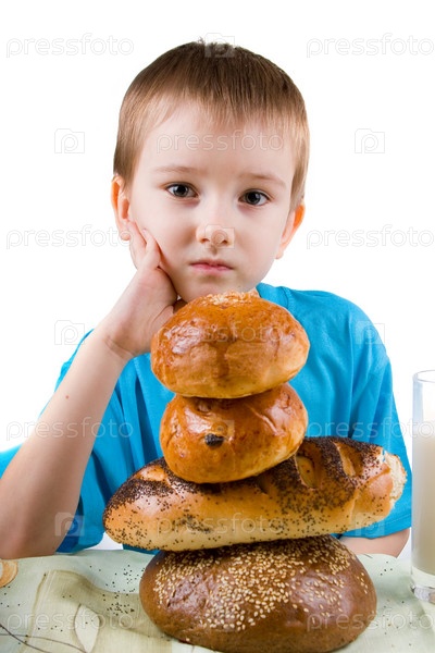 Мальчик сидит перед стопкой сдобы на белом фоне