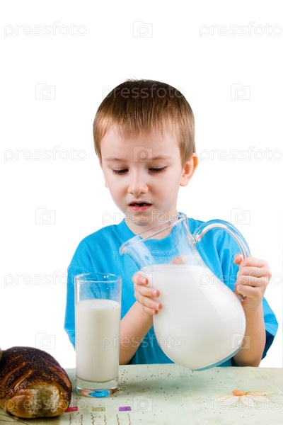 Мальчик наливает молоко из кувшина в стакан на белом фоне