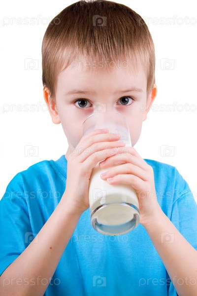 Мальчик пьет молоко на белом фоне