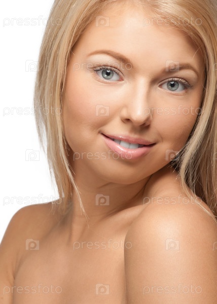 Красивая девушка с идеальной здоровой кожей и естественным макияжем на белом фоне