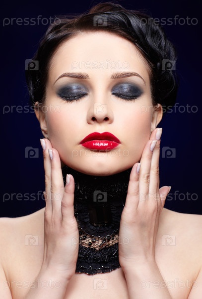 Молодая брюнетка на синем фоне в черном кружевном воротнике