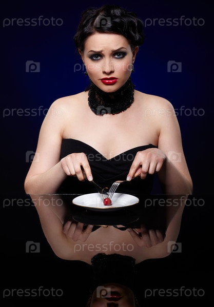 Несчастная девушка собирается есть одну красную вишенку на тарелке