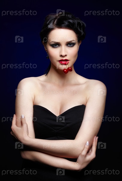 Молодая брюнетка с двумя красными вишнями во рту