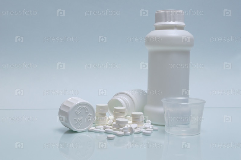 Таблетки, белый контейнер и мерный стакан