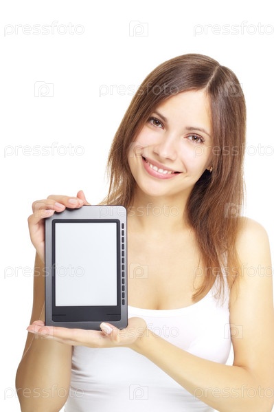 Девушка с электронной книгой на белом фоне
