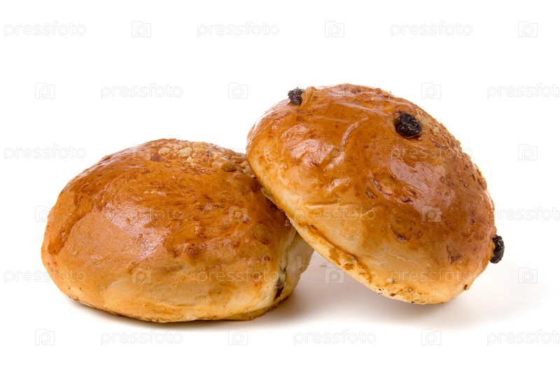 Две булочки с изюмом на белом фоне