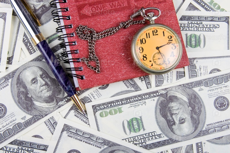 Карманные часы, блокнот и ручка на долларах